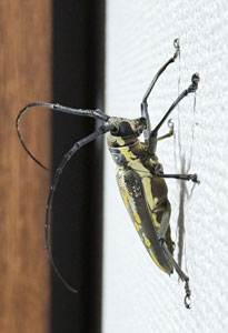 部屋の壁に大きなカミキリムシ。金色の模様が美しい。