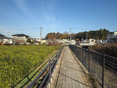 図1 右手に霞川、左手に茶畑、正面に鬱蒼とした林。