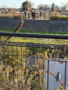 図4 バードウォッチャーが望遠カメラを向けているのはカワセミか?図の右下に拡大写真(藤橋)