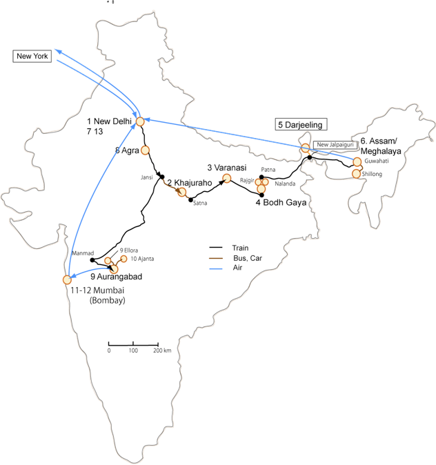 独り旅の首都ニューデリーでインドにショック!、カジュラホーで美しい彫像群に感嘆、ガンジス川のバラナシーで心の底からリラックス、仏教発祥のブッダガヤで心を洗い、ヒマラヤに近いダージリンではエベレストを遠望、「秘境」アッサム地方で自然を満喫、デリーに戻り妻・久美子を迎え、ともに世界の美宝・タージ・マハールへ、エローラの奇跡の窟院、アジャンタのすばらしい壁画を観光後、ムンバイ(ボンベイ)では海を渡りエレファンタ島の大きなヒンズー彫像に見とれ、またムンバイの博物館を見学した。12月19日無事にNYの自宅に戻った(12月19日朝記)。