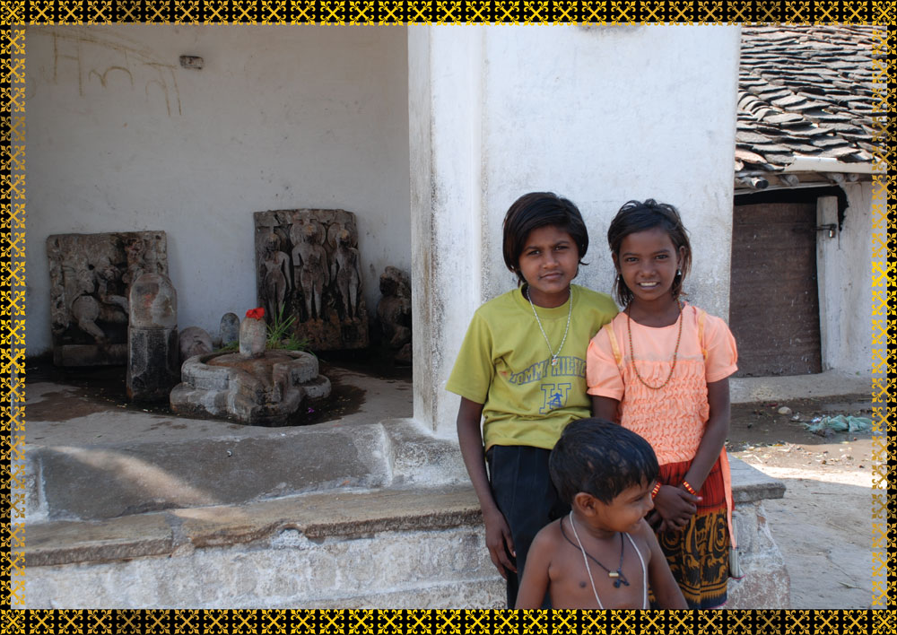 カジュラホーの小さな村の中にあるほこらの前で。中央に祭られているのはリンガ(男根)とヨーニ(女陰)と思われる。