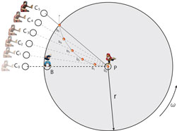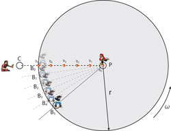 ピッチャー、バッター、キャッチャーが図のような配置。ピッチャーがバッターに直球を投げる。円盤は反時計回りに回転しているのでボールはバッターの右方向にそれる。 (コリオリ効果) |