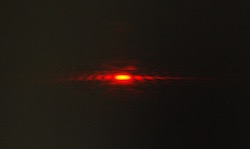 伝導紙にカミソリで1本の切れ目を入れたものにヘリウムーネオンレーザーを照射 単スリットで現れる干渉模様の神秘 |