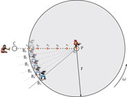 ![]() ガリレオの地動説は教会のみならず科学者にも批判された。批判者は、「もし大地が動いているなら球はまっすぐに落ちずにずれが起こるはずだ」(図左)と言った。ガリレオはこれに反論するのに右のような図を示したという。 |