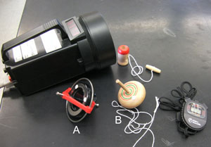 二輪車だけではすぐ倒れる。 ジャイロごまを回してから走らせると数メートルは楽に走り続ける。 (Joshin Soneの傑作) |