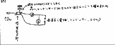 直列共振回路において、LとCの値を適当に選ぶと、回路を流れる電流が最大になる(共振)ことを、電球の明るさの変化で視覚的に確かめる。 (1)図のように配線し、コイルの鉄心をスライドさせ、Lの値を変える。電球の明るさが、暗-明-暗のように変化する。 コイルはスライダックで代用できる。 留意点等:コンデンサーは、いくつかのコンデンサーを並列接続してやればよい。 使用器具:スライダック 100W電球 コンデンサー 8μF程度 電磁現象実験器のコイル(500T) |