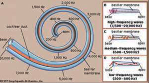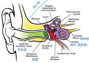 Fig.10はヒトの耳の構造4で、音波の振動は、鼓膜から3個の耳小骨に伝わった後、蝸牛(渦巻管)で電気信号に変換される。Fig.11は渦巻き状の蝸牛を模式化した図5で、蝸牛の内側に並んでいる有毛細胞がそれぞれ固有の振動数を認識する仕組を示している。
