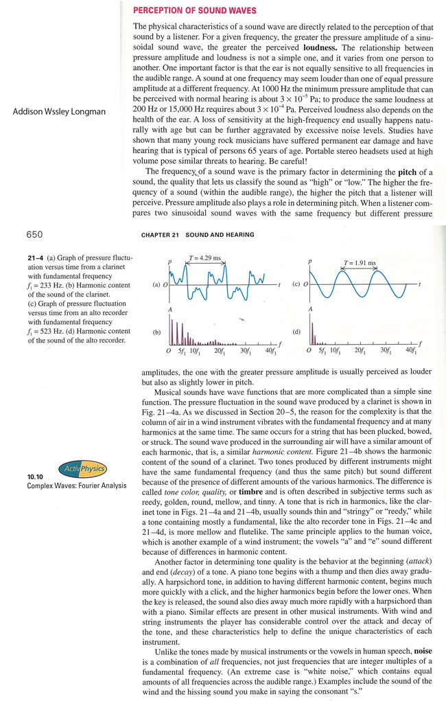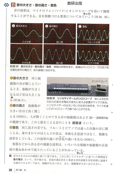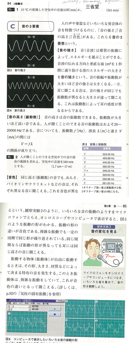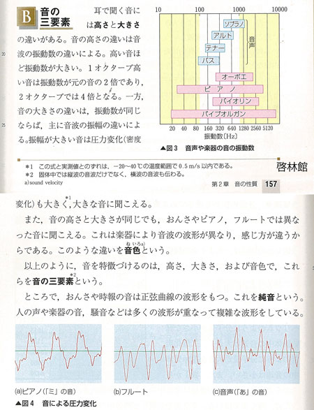 「楽器の音の高さは最も強度が大きい基音の振動数で決まり、基音の整数倍の振動数である倍音は強度は小さいが音に彩を添えて楽器に特有の音色を与える。」