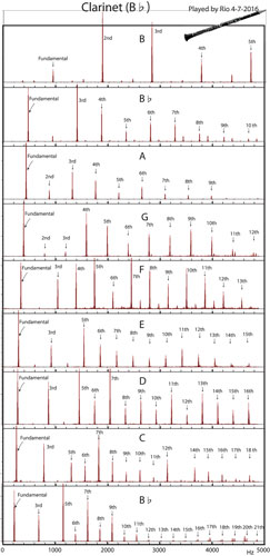 ・どの音も多くの振動数を含む。・図の 一番下のB♭の音は、最も低い振動数は233Hzでこれが基音 fundamental で、次が699Hz(3倍音)、1166Gz(5倍音)。次に1399Hz(6倍音)の小さいシグナルの後1631Hz(7倍音)、8倍音、9倍音・・・と続いている。強度の高いものは、9倍音までの奇数倍音で、その強度も基音と同じレベルである。6倍音以上では小さい偶数倍音がある。