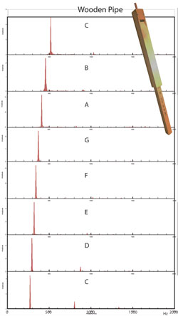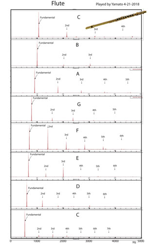 ・全体に見ると、倍音が比較的少なくて純音に近い。クラリネットと対照的である。倍音は偶数倍音、奇数倍音ともにあり、この楽器が「開管楽器」とするモデルに対応している。