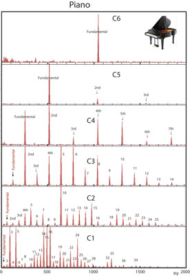 ・低音ほど倍音の数が多い点、基音の強度が極端に小さい音がある点、はバイオリンと同様な傾向である。C1〜C3ではミッシングファンダメンタルに近い。