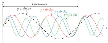 楽器や人の声など「音高が明確な音」(ドラムなどは音高が明確でない)を、基音と倍音それぞれの振動数を持つ正弦波(純音)の集合として捉える。例えば、100, 200, 300, 400, 500 ・・・Hzの集合体。この場合、全ての純音に共通の周期を与える振動数は100Hzであり、これが「基音」として音高となる。つまり振動数の「最大公約数」が音高として聞こえる、とする考え方だ。Fig.8は、a=2π x100[Hz]として、200Hzなどの倍音全てが基音100Hzの周期を持つことを描いた。