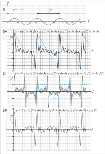 (c) 基音と奇数倍音、3倍音〜15倍音、の正弦波を足し合わせたもの。青い破線で示したように「矩形波」と呼ばれる波形に近い形でその周期は基音の周期にほぼ一致する。