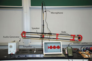 Fig.11 上部の音の出口にマイクロフォンを設置。Vernier社のLabProをインターフェースとしてパソコンで解析する。ソフトウェアは、Vernier社のLoggerPro。2)実験