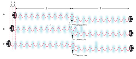 B:一方の経路の長さが半波長(λ/2)長くなるとマイクロフォンの位置で音波は打ち消し合う(destructive)。