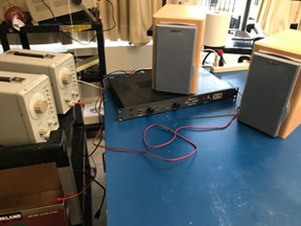 使用器具: 低周波発信器(2台)、アンプ、スピーカー(2台)
