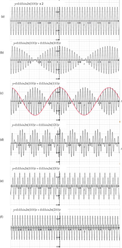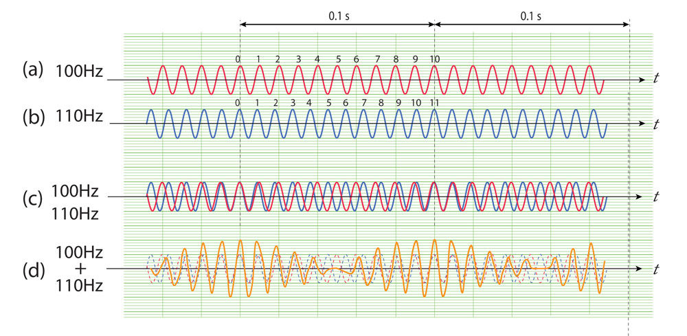 (c)100Hz +110Hz 10Hzの周期のうなりが派生している。2個の波の干渉の結果、105Hzの波が10Hzの周期で強弱を繰り返しておりこれがうなりの周波数である。一方、うなりの「波」は図の赤の実線で示したもので、その周期はうなりの周期の2倍であることがわかる。これが、