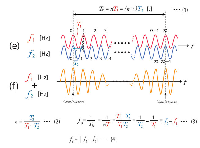 ここでf1<f2、つまり波2の方が高い音であるとする。それぞれの音波の周期はT1=1/f1、T2=1/f2である。両方の波が強め合って(constructive)から次に強め合うまでの波1の山の数を