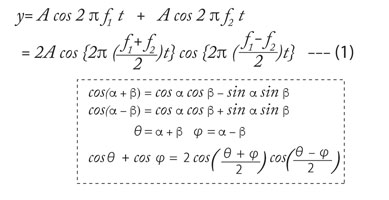[Hz] と周波数f2[Hz]で同じ大きさAの振幅を持つ2個の波を三角関数で足し合わせた式は、式(1)のように変形できる。式の変形は破線で囲んだ三角関数の公式を用いている。