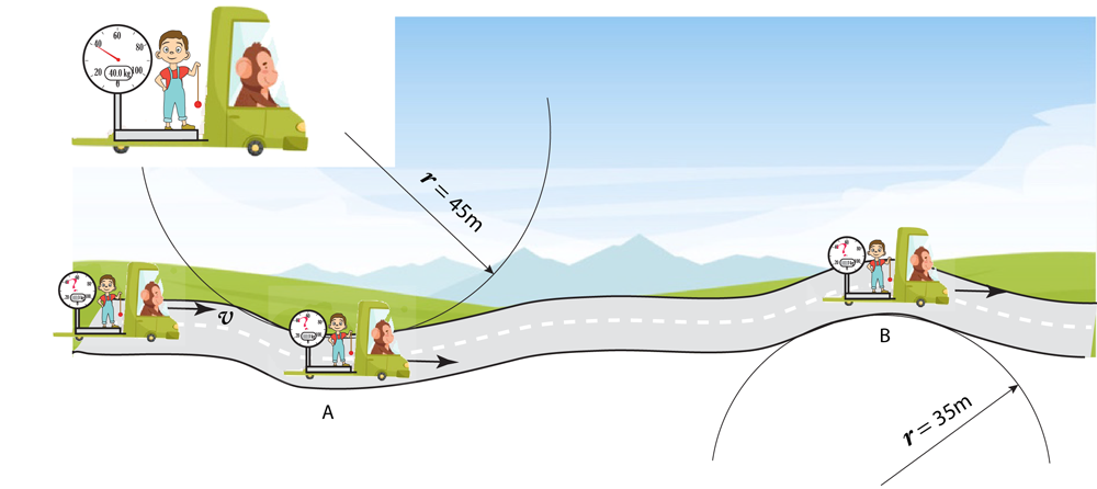 Q2)図で自動車が36km/hで等速走行していとき体重40kgの少年が乗った体重計は地点AとBでどのような値を示すか?