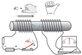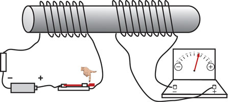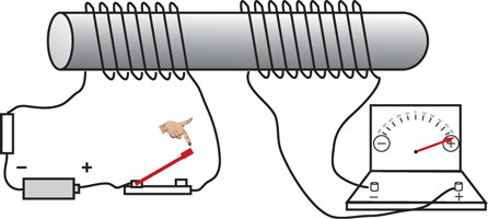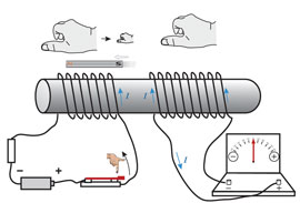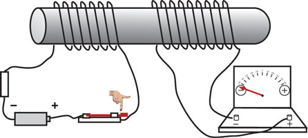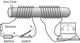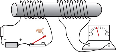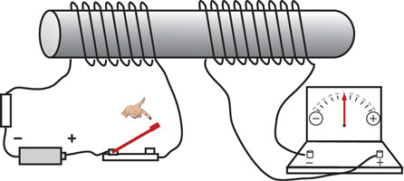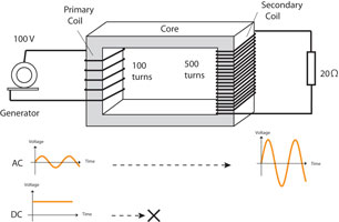 上の実験で、スイッチを閉じた瞬間または 開いた瞬間だけに2個のコイルの間で電流が受け渡されることがわかる。スイッチを閉じたままの一点電流では右のコイル(2次コイル)には電流は流れない。コイルの中で時間と共に変動する電流は