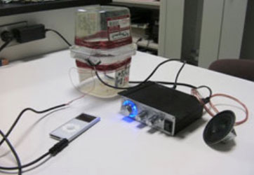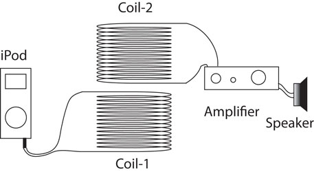 Fig.4 2個のコイルを向かい合わせる。コイル−1にiPodの音楽の電流を流し、コイルー2にアンプとスピーカーを接続する。2個のコイルの間を広げると音声が途切れるが、向かい合わせると音声が聞こえ、2個のコイルの間で音声信号が受け渡されていることがわかる。