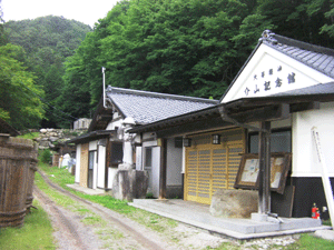 さらにドライブで庄川の渓谷に沿ったS字カーブの狭い道を北上することおよそ1時間、小牧ダムそばの船発着場に着く。ここに車を残して、遊覧船に乗り静かな湖面を南へ30分、大牧温泉へ。湖面から立ち上がる急な山肌に貼りつくように温泉旅館が建っている。ここの源泉は53℃と熱くて透明。露天風呂では、源泉を高所から岩壁沿いに伝わり下ろしている。温度調節の工夫か。湖と周囲の緑をのんびり楽しんだ。説明によると、小牧ダムができる前には切り立った千尋の谷底に小さな村々があったという。今は水底にあるその土地が(全く根拠はないが)お雪ちゃんが落ち込むことを心配した「畜生谷」ではなかったかと空想してしまったほど山深く谷深く、外界から隔絶されたところであった。