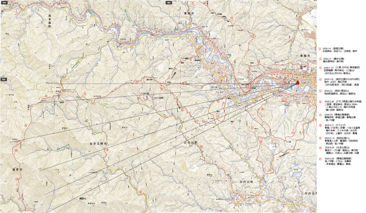 山を眺めていると飽きない。今ベランダから見える山(下の写真)で一番高いのは大岳山。昔、中学生のころ最初に覚えた奥多摩の山の名前の一つだ。当時参加していた郷土史探訪会でどこかに行ったとき、遠方に見える山々の名前を教えてくれたリーダーがいた。「あそこのおっぱいのような形の山が大岳山で・・・」という解説が記憶に残った。そこから見えた形は確かに乳房に乳首がのった形をしていた。今見る大岳山の形はその時とちょっと違う。角度によって変わるのかな?どこから見たら正しいおっぱいの形に見えるのだろう?大岳山の右手に富士山をなだらかにした形の山がある。青梅の知人が御岳山と教えてくれた。信仰を集める神社で有名で子供の頃ケーブルカーで登ったことがある。大岳山の左手の山は頂がふたこぶになっている形が面白い。あれはなんという名だろう? さっそく地図を買ってきた。昭文社の「奥多摩」はハイキングコースが詳しい。さらに新宿紀伊国屋に行き、国土地理院1/2.5万地図「武蔵御岳」と「五日市」を手に入れた。それらの地図を手にした時その美しい印刷に驚くと同時に中学時代の自分が心の中に戻ってくるのを感じた。東京杉並区立宮前中学の社会科の先生に地図を教えてもらい社会科部のフィールドワークで多摩、奥多摩を歩きながら地図と親しんだ。しだいに国土地理院の地図を眺めていると、それぞれの場所の情景が浮かんできて飽きないようになった。登山地図や観光地図と合わせて読み込むと自分独自の旅を創作できるのが楽しかった。小遣いでたくさんの1/5万と1/2.5万地図を買った。あの貴重なコレクションを手放したのはいつだったのだろうか。こうして国土地理院の地図を再び手にできてあの頃の気持ちが一気に戻ってきて地図と山を楽しめる状況になったのは素晴らしいことだ! 眼前の山と地図を比較して、青梅の知人が「御岳山」と教えてくれた山は実は別の山で「日の出山」ではないか、と思った。では、日の出山より標高が高い御岳山はどこにあってなぜ見えないのだろう?こんな疑問を解くことを最初の課題として楽しむことにした。 このページは2020年正月以来のハイキングの記録を簡単にまとめている。上の課題に関連する写真、峰々などの名前の同定、課題の解析結果は下の写真をクリックしてご覧ください。 |