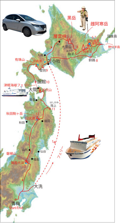 詳しい日程計画を立てぬまま、およそ2週間の旅行を実施したルートが図1である。まず、大雪山・黒岳と雌阿寒岳の2峰の登山を果たした。道央を横切って野付半島へ。函館から下北半島にフェリーで渡り、東北地方を縦断した。