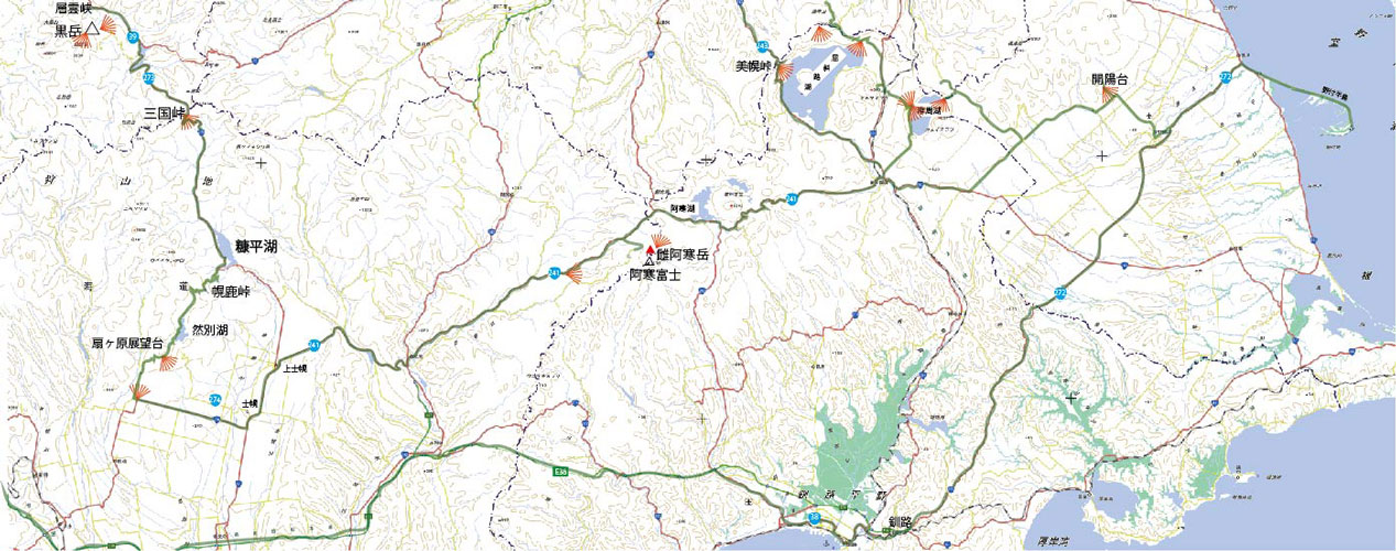 広大な景色を展望して、見える土地を地図と照らし合わせて「同定」するのが私の趣味の一つだ。図2は、層雲峡から釧路のドライブのルートを