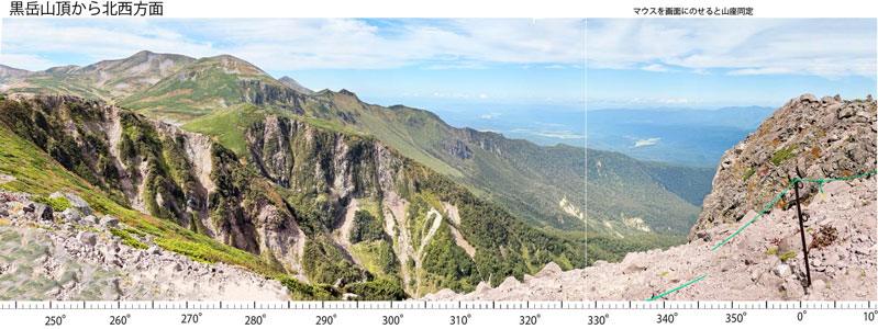 図12 黒岳山頂からの眺望。(マウスを当てて山座同定) 目につくのは遠方の白っぽい地域だが、地形図(図13)と比較してもそれが