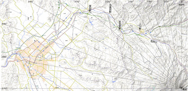 どこなのかよくわからない。 GoogleEarthの地図(図14)と比較した。上川駅近辺の街と二つの大きな牧場とわかった。GoogleEarth