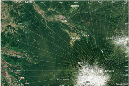 図14 黒岳山頂から北西方向の山座同定に使用したGoogle Earth図。