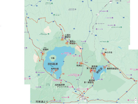 2025.9.13 ~ 9.15午前 摩周湖と屈斜路湖周辺をドライブしたルートを左の図36の地図にまとめた。
