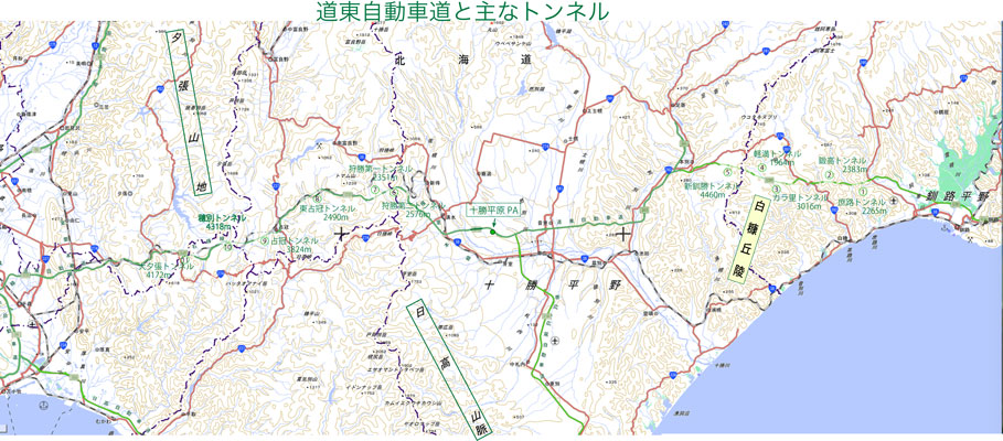 道東自動車道 2025.9.16 釧路からは、道東自動車道をドライブして道央と道南に向かう。 通過する地域を地図(図65)で概観しよう。釧路平野から西へ。白糠丘陵を越えると帯広のある十勝平野へ。次いで、日高山脈を横断。山中の占冠を過ぎて夕張山地を横断、千歳地域の平野に達したところで道央自動車道に合流する。長い11のトンネルを図に示した。