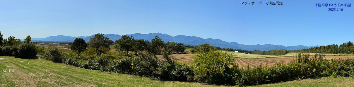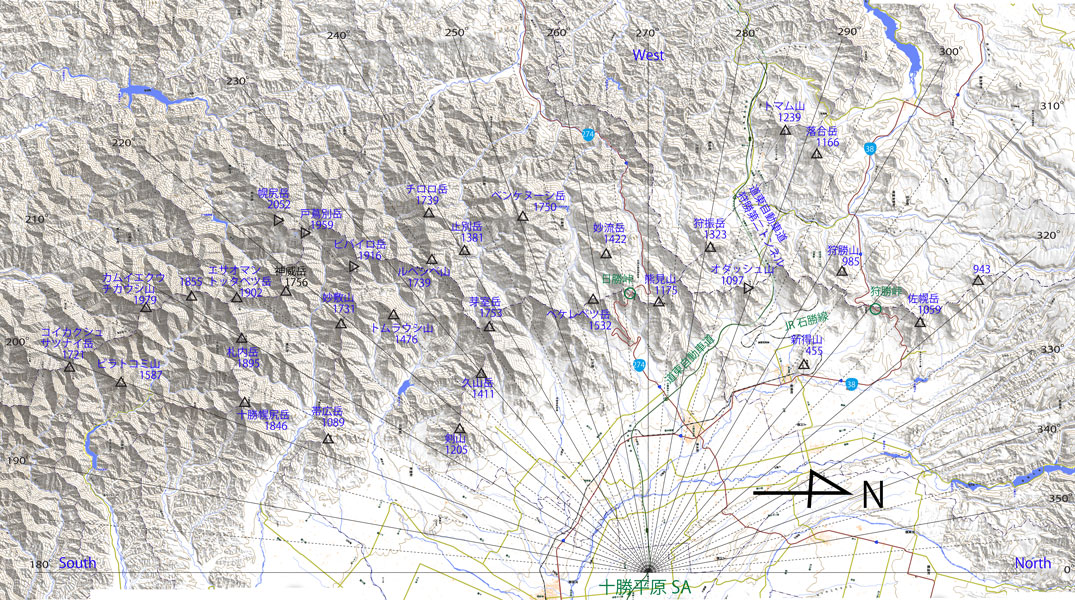 日高山脈 十勝平野から日高山脈に入る手前にある「十勝平原パーキングエリア」で日高山脈を展望した(図66)。ここから見える最高峰は芽室岳(1754m)であるが、それに連なる峰も同じような高さで山座同定が難しい。帰宅後、地図(図67)と比較して山座同定を実施した。日高山脈の南部(左手)は、高山が連なり、北部(右手)部分は比較的標高が低く、ここに主要な交通路が集まっていることがわかる。交通路は、南から順に、国道274号、道東自動車道(E38)、JR石勝線、国道38号、である。これからあのE38(道東自動車道)の狩勝第二トンネルで山越えだ。